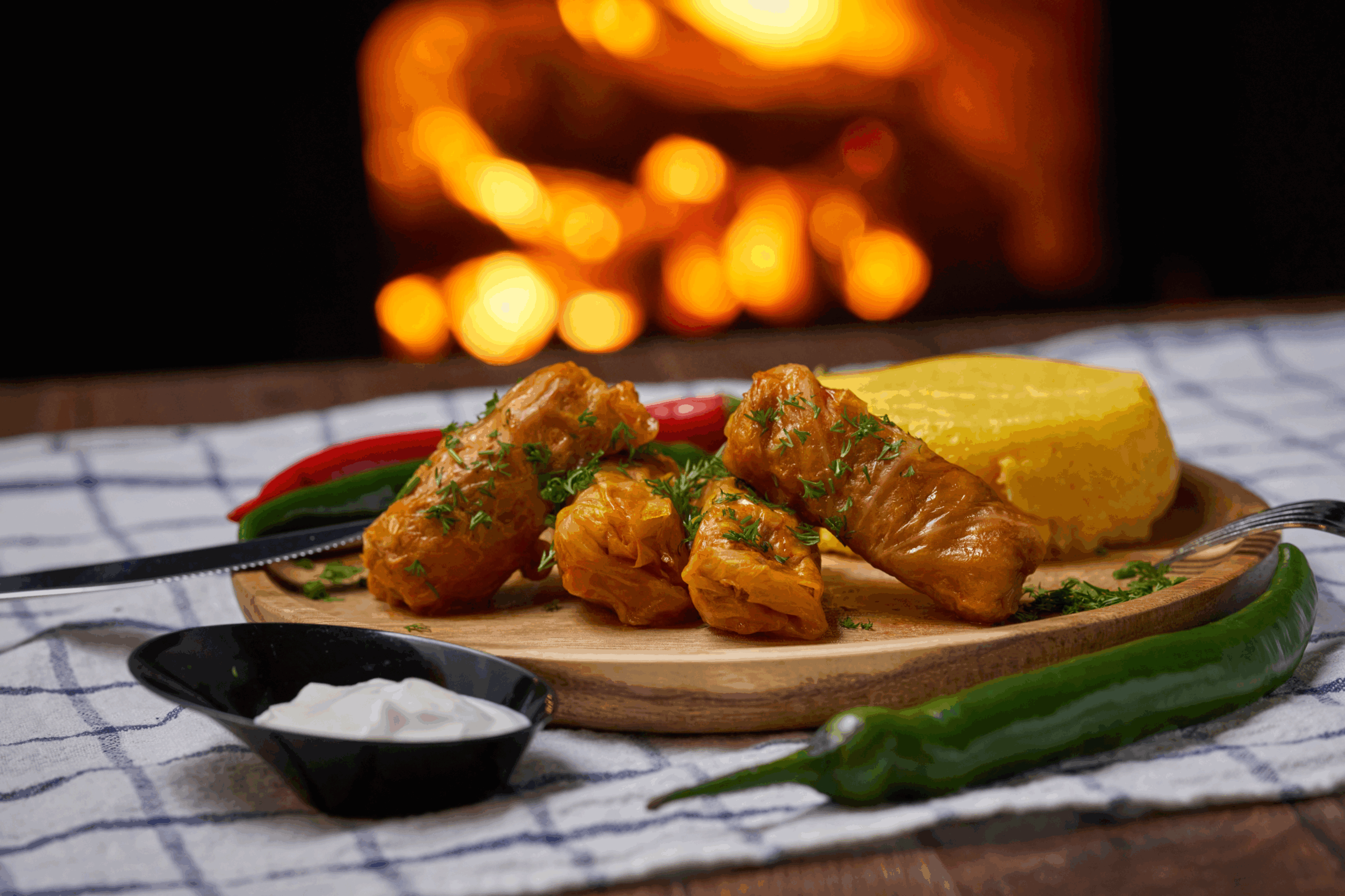 De Crăciun, masa este o adevărată sărbătoare a bucuriei. Bucătarii noștri pregătesc cu drag sarmale în foi de varză, pomana porcului, porc la proțap, mămăligă aurie, cârnați de casă și murături crocante, toate asezonate cu vinuri locale din podgoriile Drăgășaniului.