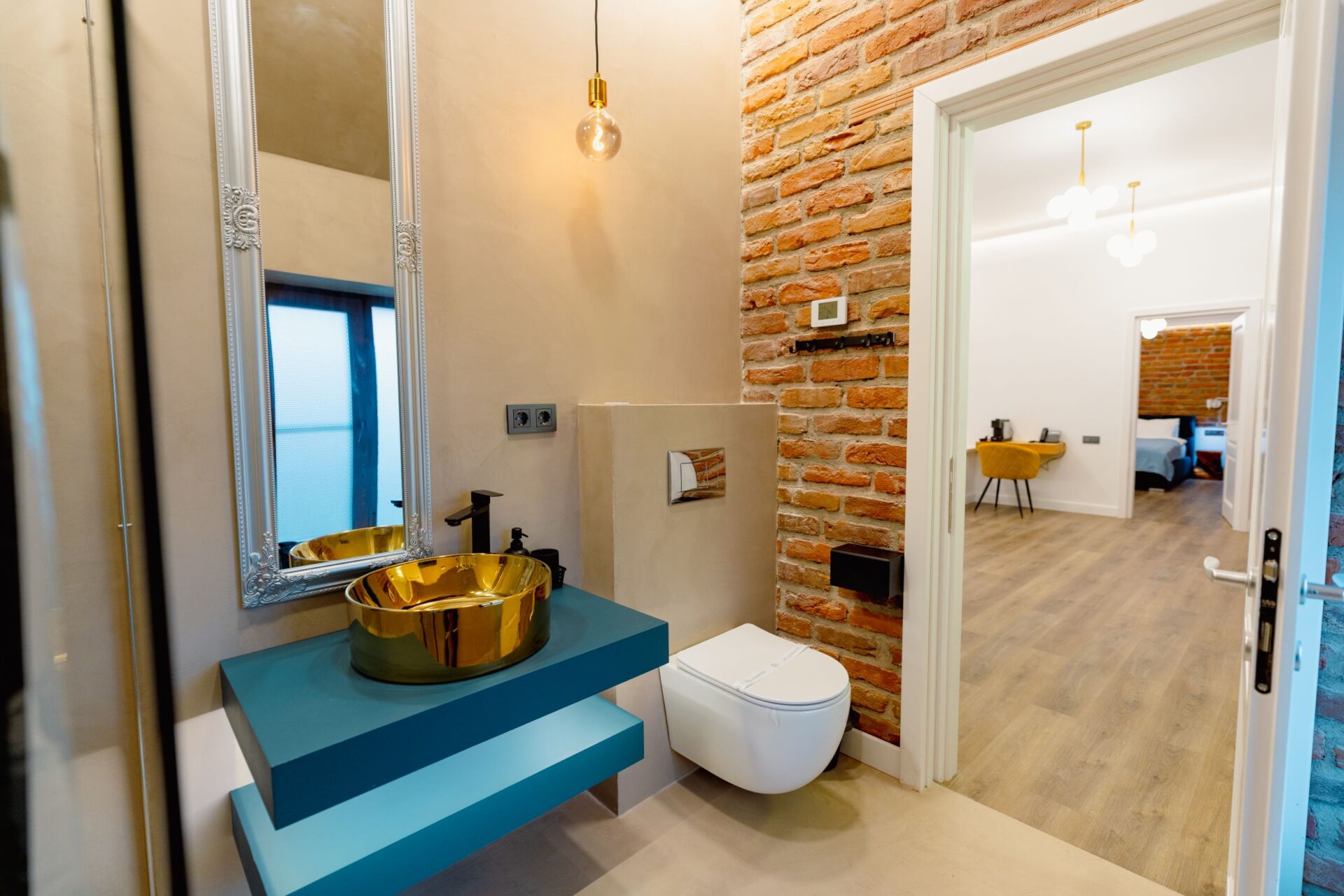 Apartment 4 im Hotel 5Hills Drăgășani ist für Gäste konzipiert, die mehr als nur ein einfaches Zimmer zum Übernachten wünschen – einen Ort, an dem Design, Licht und Ruhe perfekt zusammenkommen. Das geräumige Wohnzimmer ist mit einem bequemen Schlafsofa, einem Smart-TV und einem speziellen Bereich zum Entspannen oder geselligen Beisammensein ausgestattet.