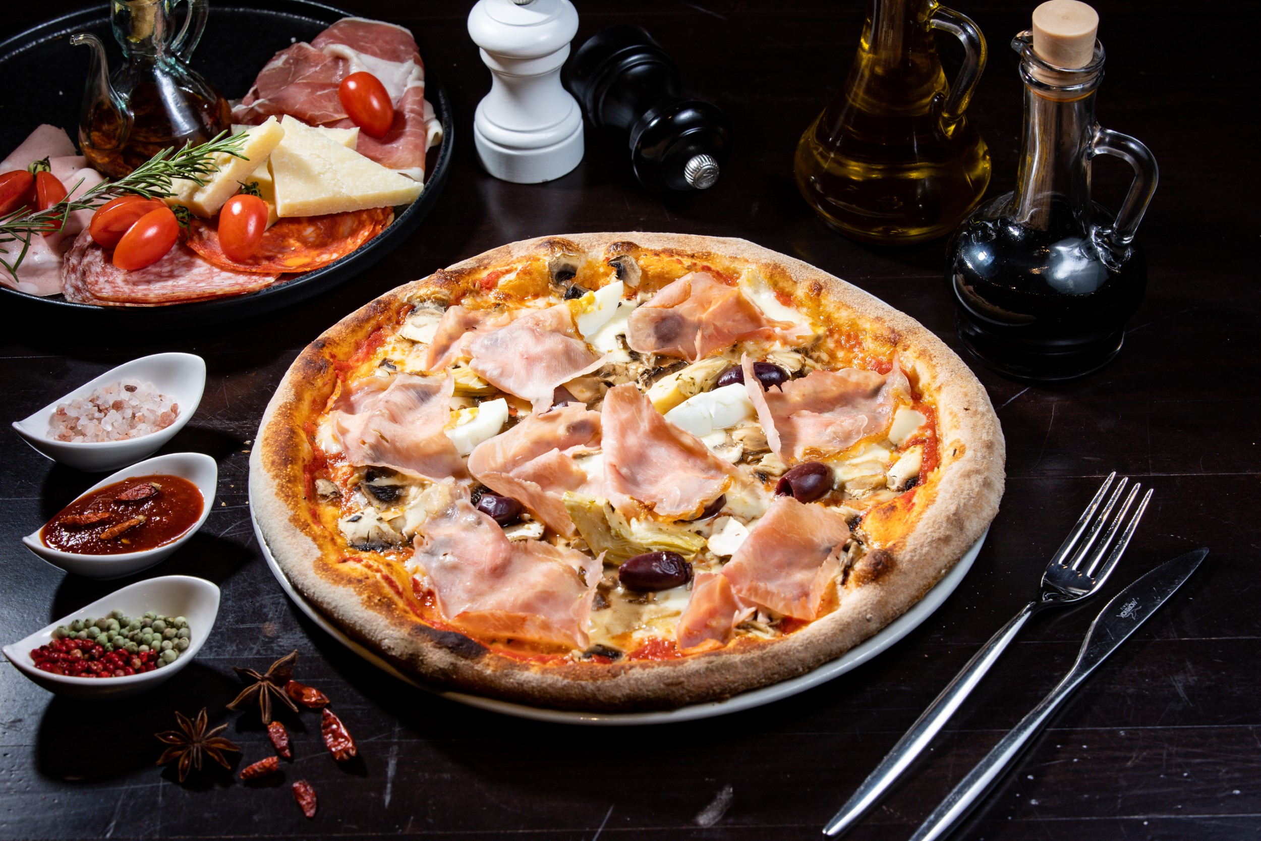Pizza Capriciosa, livrare pizza in Dragasani. Ingrediente: mozzarella, sos rosii, prosciutto crudo, masline, ciuperci. Alege pizza Medie 550 gr sau Mica 350 gr.