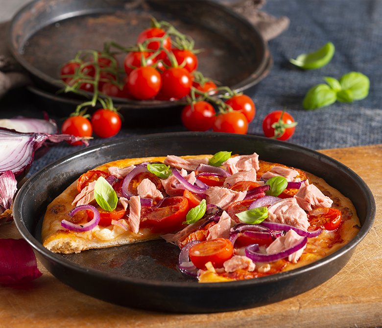 Pizza cu ton, livrare pizza in Dragasani. Ingrediente: mozzarella, ton, rosii cherry & ceapa. Alege pizza Medie 550 gr sau Mica 350 gr.