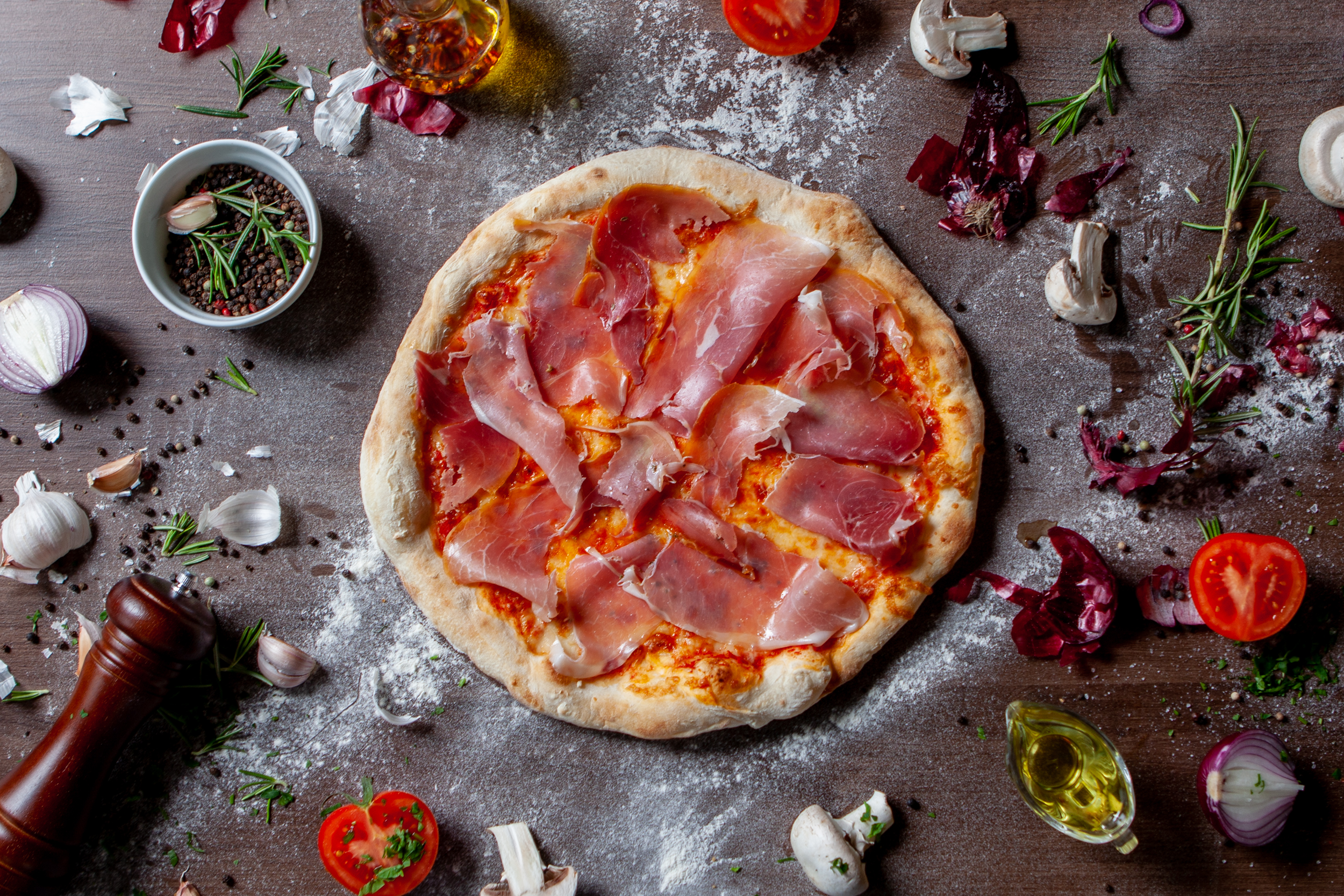 Pizza Rustica, livrare pizza in Dragasani. Ingrediente: mozzarella, sos rosii, ardei & prosciutto crudo. Alege pizza Medie 550 gr sau Mica 350 gr.